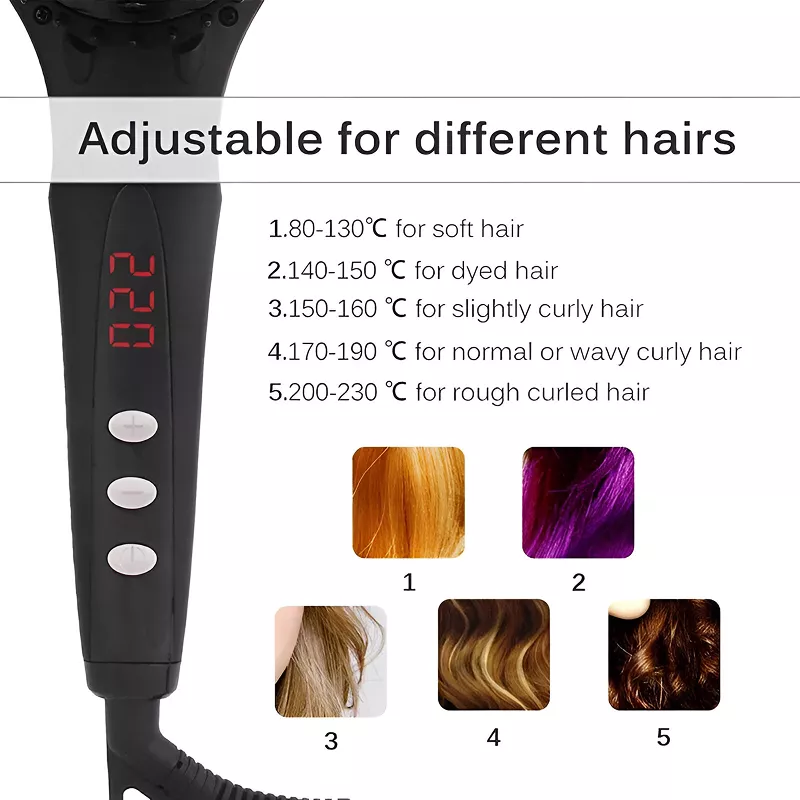 With 10 temperature levels ranging from 320°F to 450°F, you can customize the heat to suit your hair type. Lower temperatures are ideal for fine or thin hair, while higher settings work best for thick, coarse, or curly hair. The LCD digital display makes it easy to monitor the temperature for precise styling.